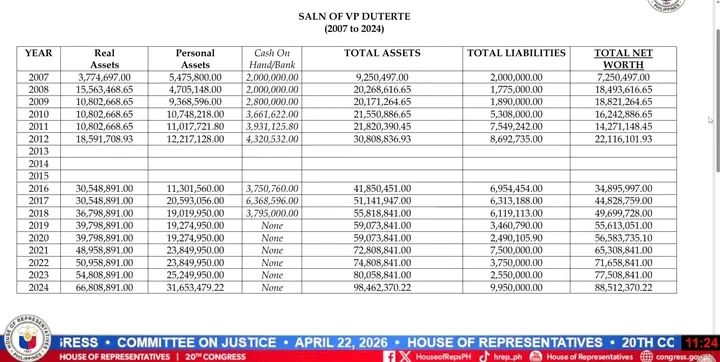 Records presented before the panel showed that Duterte’s net worth rose from approximately ₱55.6 million in 2019 to ₱88.5 million in 2024, despite the reported absence of liquid assets during the same period. Lawmakers said the discrepancy warranted further clarification as part of the impeachment inquiry.